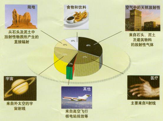 人們受到的放射性照射大約有82%來(lái)自天然環(huán)境,大約有17%來(lái)自醫(yī)療診斷,而來(lái)自其他活動(dòng)大約只有1%。