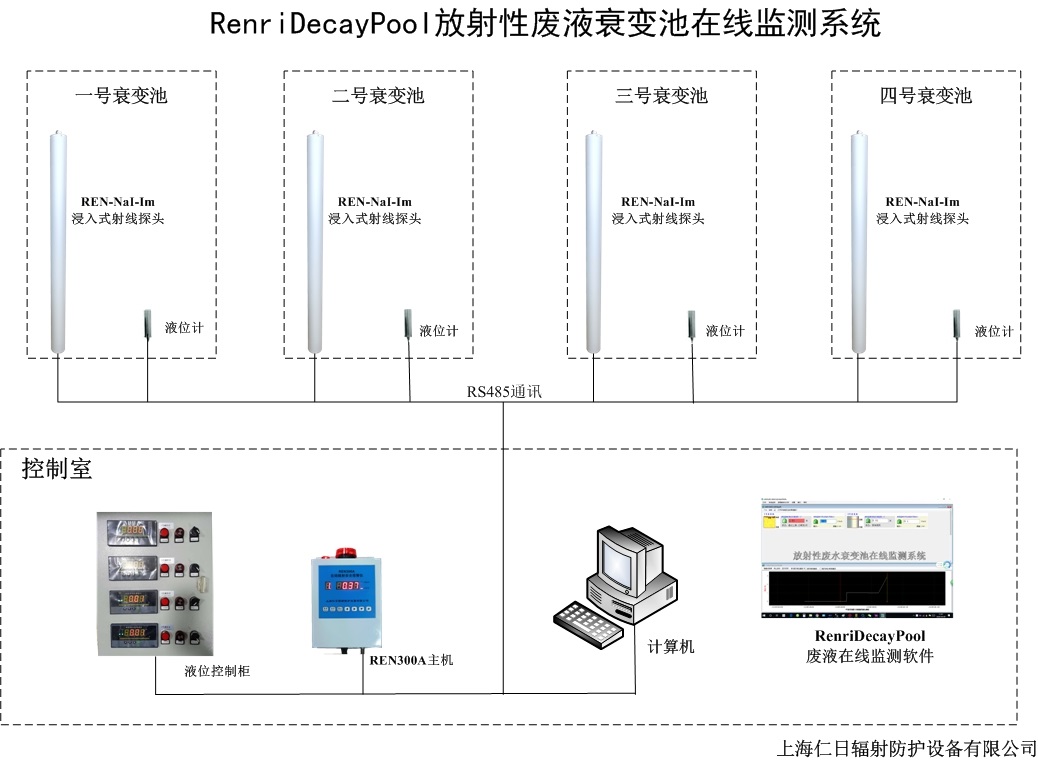 本系統(tǒng)是以工控機(jī)或商業(yè)臺式計算機(jī)作為上位機(jī),以若干液位測控儀和若干REN300在線輻射安全報警儀及射線探頭為下位機(jī),通過屏蔽電纜線組成一個RS-485通訊網(wǎng)絡(luò)。在線監(jiān)測系統(tǒng)軟件是整套系統(tǒng)的大腦,由其完成全部系統(tǒng)的自動化控制過程。
